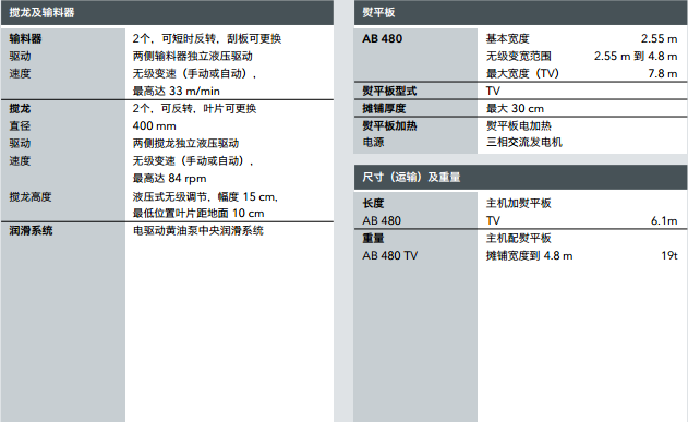 最大攤鋪寬度:8 m 運(yùn)輸寬度:2.55 m 最大攤鋪能力:700 t/h