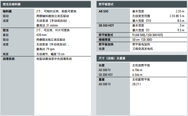 最大攤鋪寬度 9.5 m 最大攤鋪厚度 50 cm 最大攤鋪能力 1000 t/h